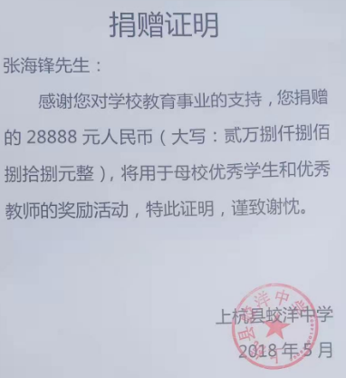 一、 2018年,公司CEO張海鋒先生捐資28888元,用于母校蛟洋中學(xué)優(yōu)秀學(xué)生與教師的獎(jiǎng)勵(lì)活動(dòng)。