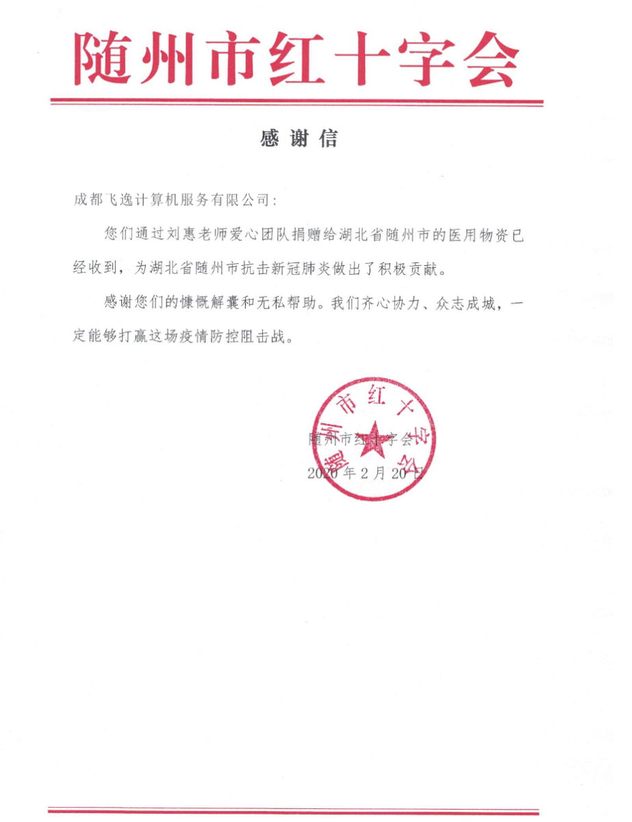 一、2020年為湖北隨州紅十字會(huì)捐資1萬(wàn)元用于隨州的疫情防疫,收到了隨州市紅十字會(huì)的衷心感謝!