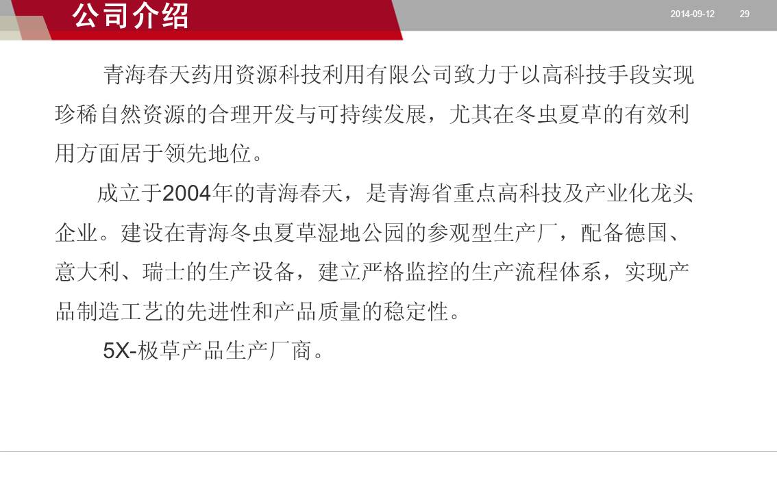青海春天歷時(shí)數(shù)年,潛心研究,智慧開(kāi)創(chuàng)了冬蟲(chóng)夏草領(lǐng)域的最高標(biāo)準(zhǔn)——極草5X冬蟲(chóng)夏草體系,依托自身強(qiáng)大的研發(fā)實(shí)力、國(guó)內(nèi)外數(shù)個(gè)研發(fā)平臺(tái)、百余項(xiàng)發(fā)明專(zhuān)利和實(shí)用新型技術(shù),使極草•5X冬蟲(chóng)夏草系列產(chǎn)品成為冬蟲(chóng)夏草物理加工領(lǐng)域的最高科技成果,為冬蟲(chóng)夏草整個(gè)產(chǎn)業(yè)帶來(lái)劃時(shí)代的變革。