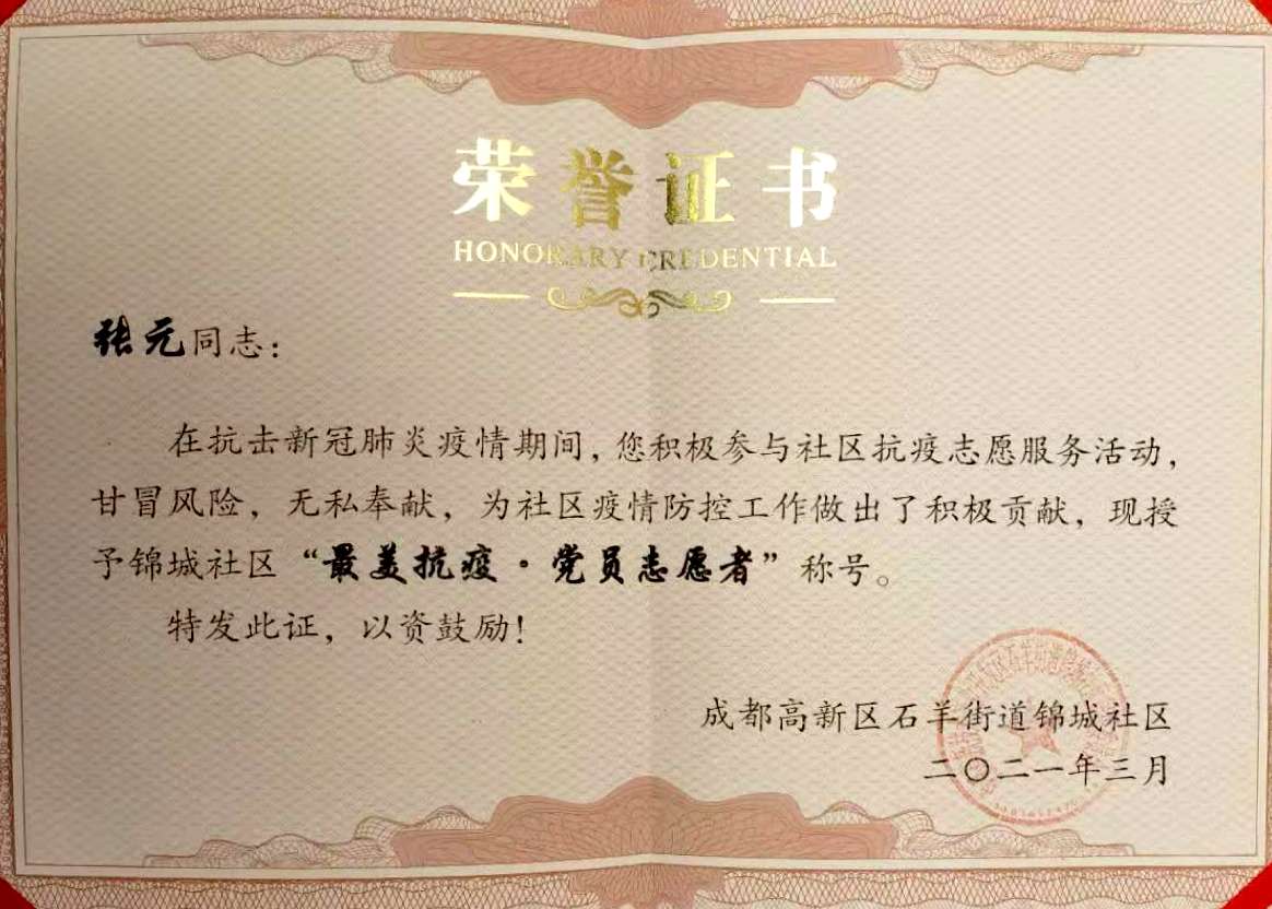 被錦城社區(qū)授予“最美抗疫 - 黨員志愿者”稱號。
