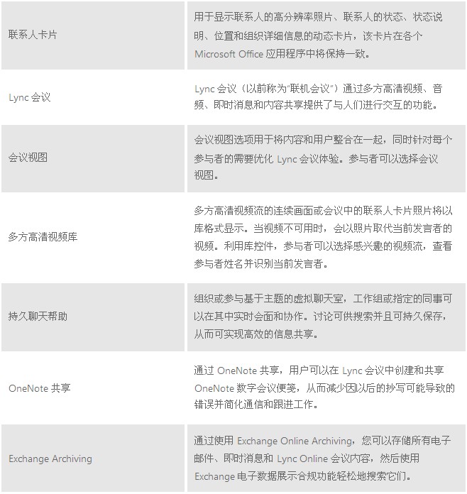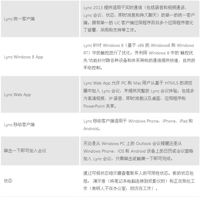 Microsoft Lync 是適合于企業(yè)的統(tǒng)一通信平臺。通過人們在日常工作中所用在移動設備中運行的 Windows 8 和其他操作系統(tǒng),Lync 可連接世界各地的用戶。Lync 提供了有關(guān)狀態(tài)、即時消息、語音和視頻的一致的單一客戶端體驗以及美妙的會議體驗。Lync 用戶可以連接到 Skype 上的任何人,并允許與世界各地的億萬人進行豐富的通信。